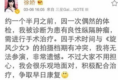 北京伟达中医肿瘤医院的常务副院长郑伟鸿医生看到这则消息后也为徐娇非常的担心,希望她可以通过治疗早日恢复健康,能够继续拍很多好看的影视剧让大家来看。除此之外,郑医生还表示,虽然徐娇的纵膈肿瘤为良性,但是如果治疗不及时的话,也是会引发恶性肿瘤的,病程越长,恶变可能越大。除此之外,手术要根据肿瘤侵犯周围组织情况行完全医治术,术后辅以放疗或化疗以及中医药治疗。虽然部分病人术后无任何问题,但是如果切除不完全极易导致复发。