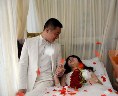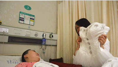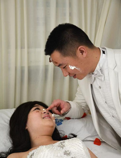 上午9时30分,婚纱摄影机构已经到达病房,工作人员给董慧化妆时,她一直面带微笑,似乎憧憬着婚纱上身的美妙时刻。因为董慧才做完手术不久,目前还不能直接坐起来,只能躺在病床上,病床也只是微微摇起,因为幅度过高会让董慧的身体难以承受。化妆完毕后,医护人员帮助董慧拔掉了正在输液的针管,亲友们则以董慧看得到的角度拿了三套婚纱站在凳子上提起来让她挑选,董慧选了一件带有白色刺绣碎花的婚纱,在工作人员的帮助下换上。